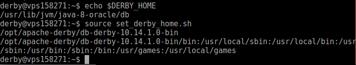 La guía inicial de Derby recomienda establecer una variable de ambiente llamada DERBY_HOME, esta referenciando el directorio donde encontraremos los binarios de Derby. Para ello recomiendo hacer un bash/script en el cuál podamos definir estas variables al momento de operar dentro del sistema operativo con Derby.